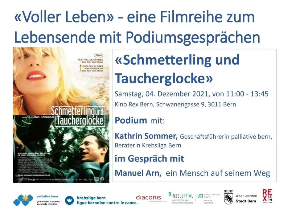 Unter dem Motto «Ein Mensch auf seinem Weg» haben sich Manuel Arn und Kathrin Sommer nach dem Film Schmetterling und Taucherglocke am 04.12.2021 auf dem Podium im Kino Rex über folgende Themen unterhalten: