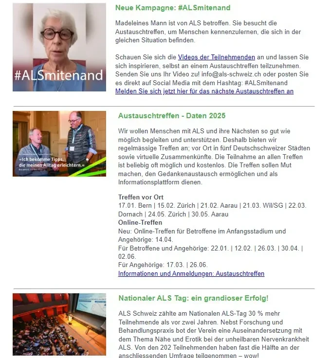 Austauschtreffen: Neue Kampagne #ALSmitenand und Daten 2025 Zahlen und Stimmen vom erfolgreichen Nationalen ALS-Tag Gesichter einer Krankheit: Willi Dudler und Nicolas Gloor Ein Wimmelbuch übers Abschiednehmen